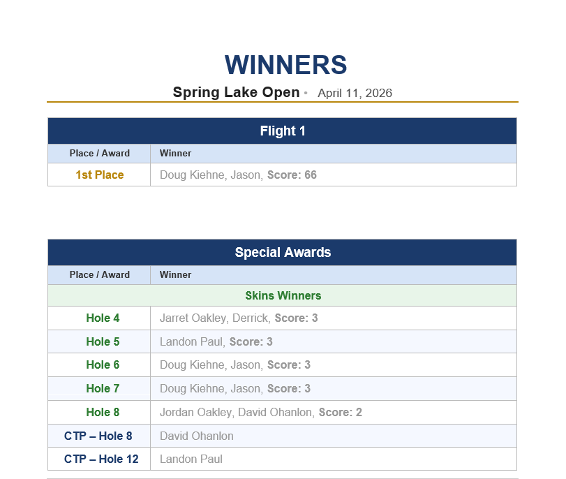 Apr 11th Spring Lake Open 2 Person Scramble $65.00 ea Sat / 1:00 p.m. Results